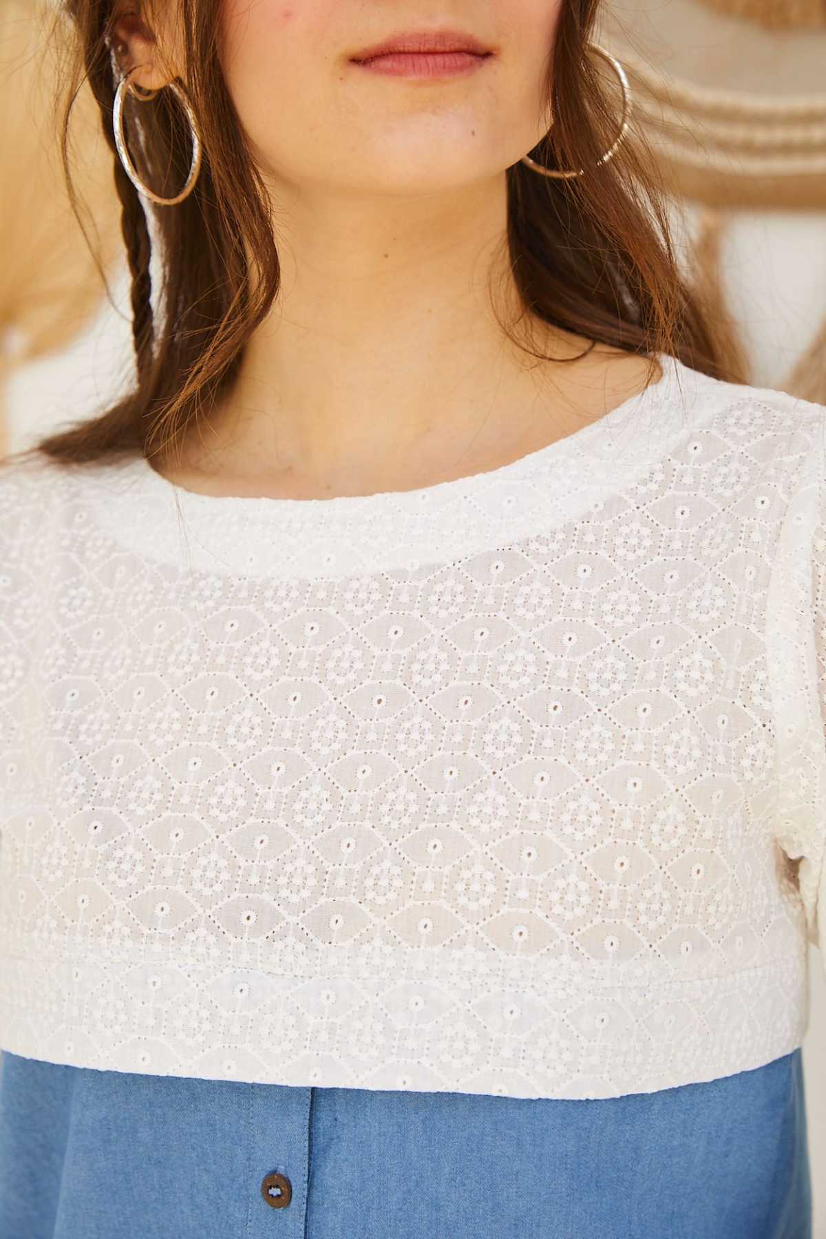 Embroidered fabric. Denim. Rounded neck. Long sleeve with buttoned cuffs.