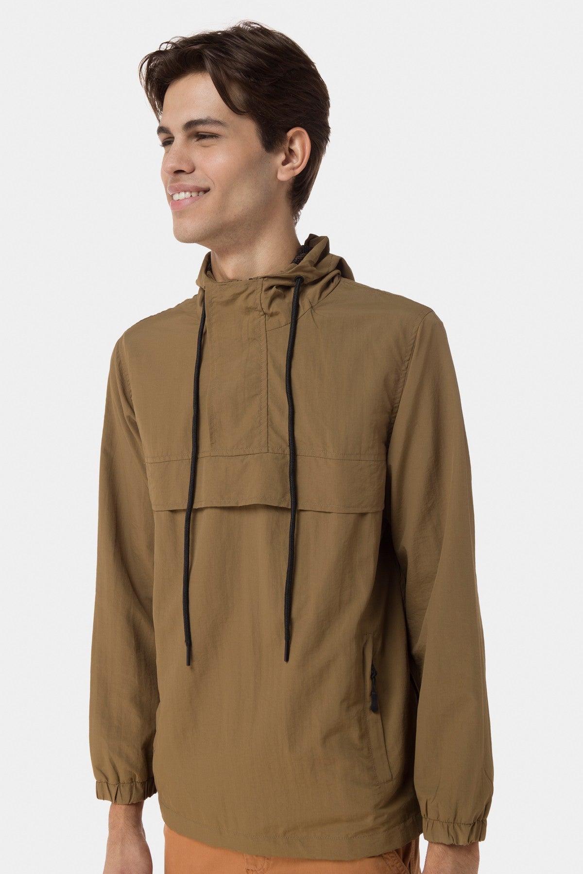 100% Nylon. Adjustable Hood With Drawstring. Center Flap Pouch Pocket. Elasticated Long Sleeves. Back Yoke