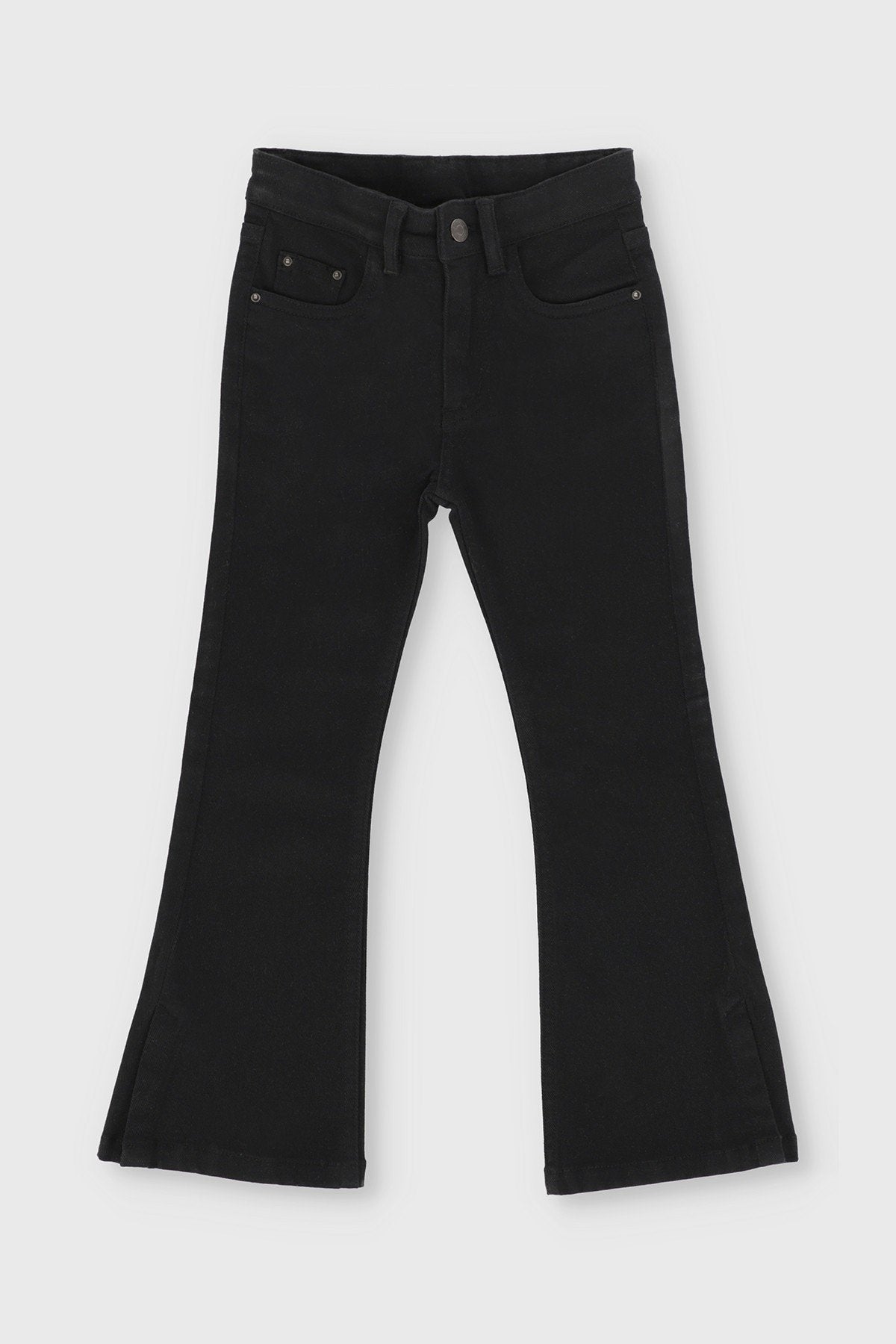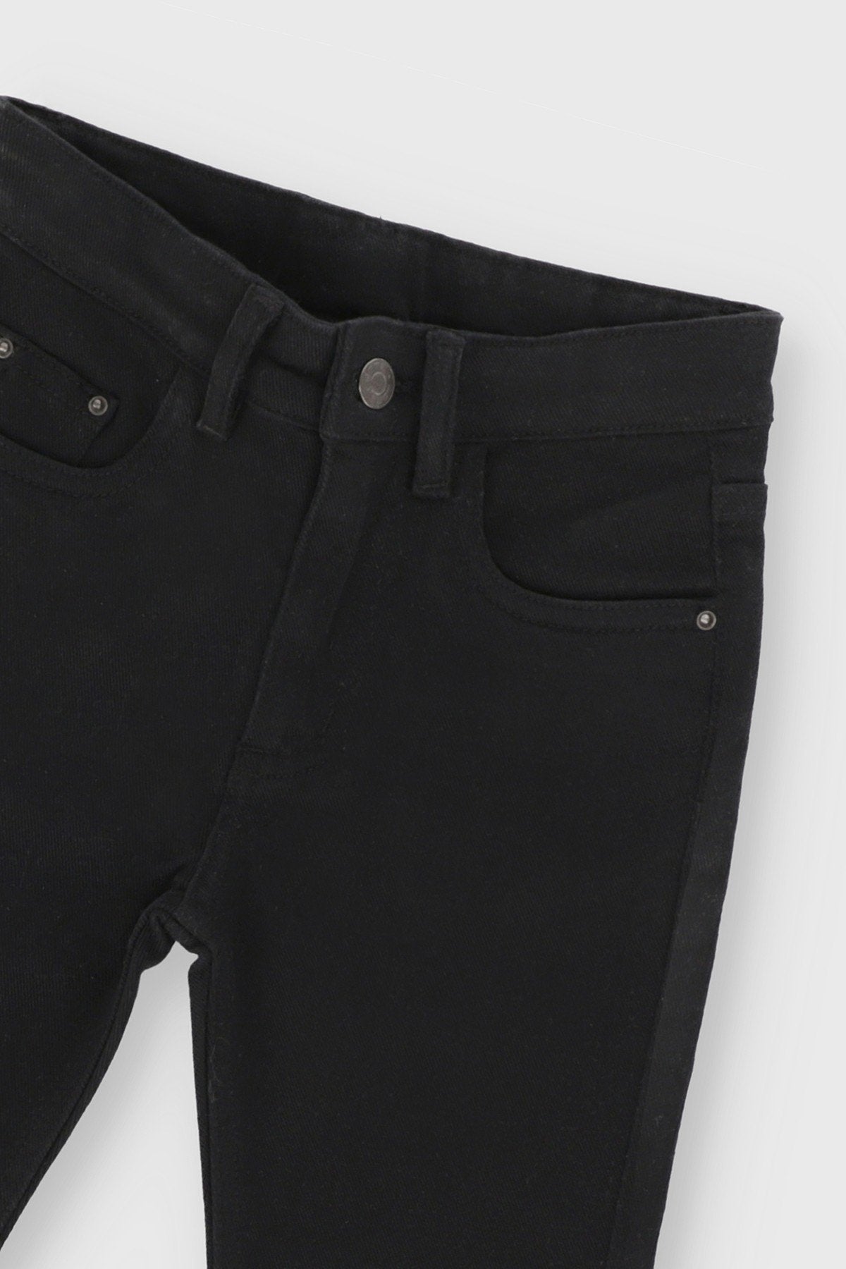 Denim Jeans With Regular Waist Band. Metal Rivets. Centre Front Button And Loops. Front Slash Pockets. Single Coin Pocket. Back Yoke And Patch Pockets. Wide Hem With Outseam Slit