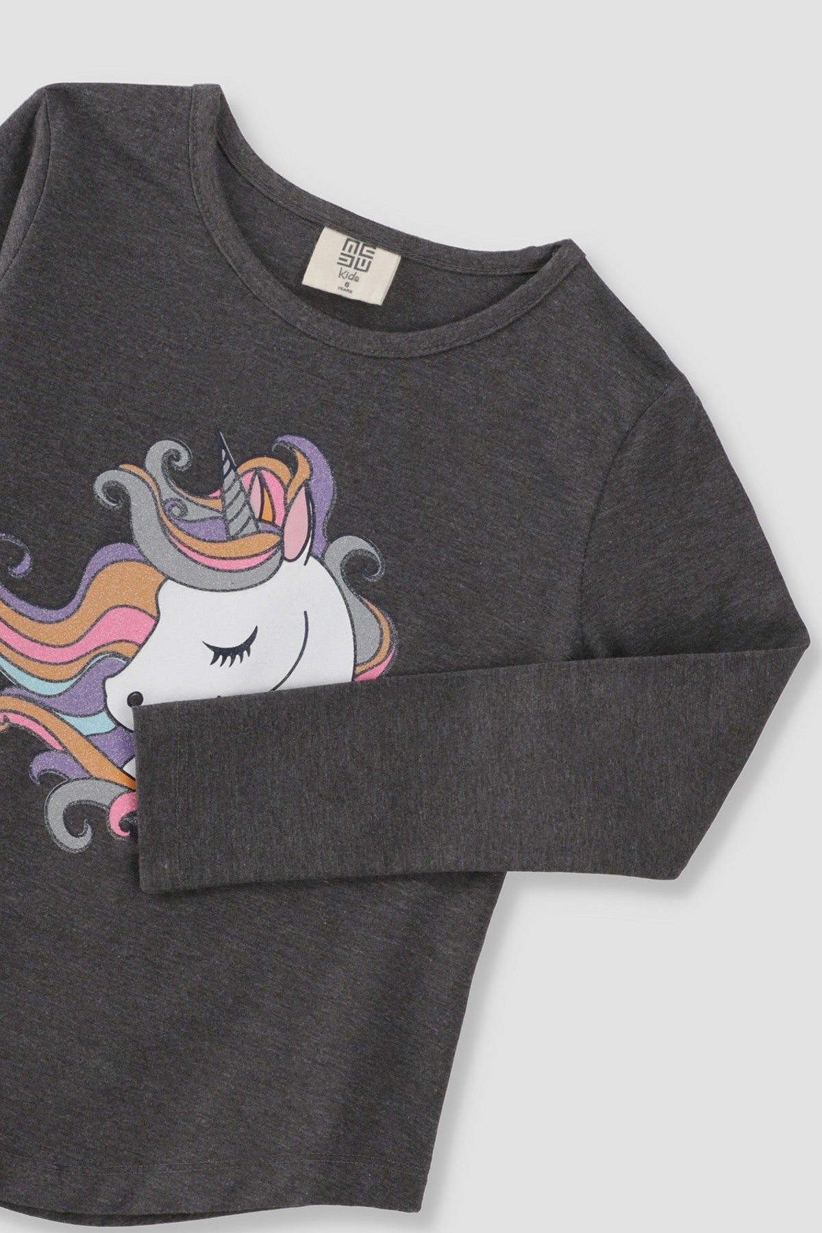 47% Cotton 48% Polyester 5% Elastane. Knitted Crew Neck And Long Sleeve T-Shirt With Unicorn Illustration