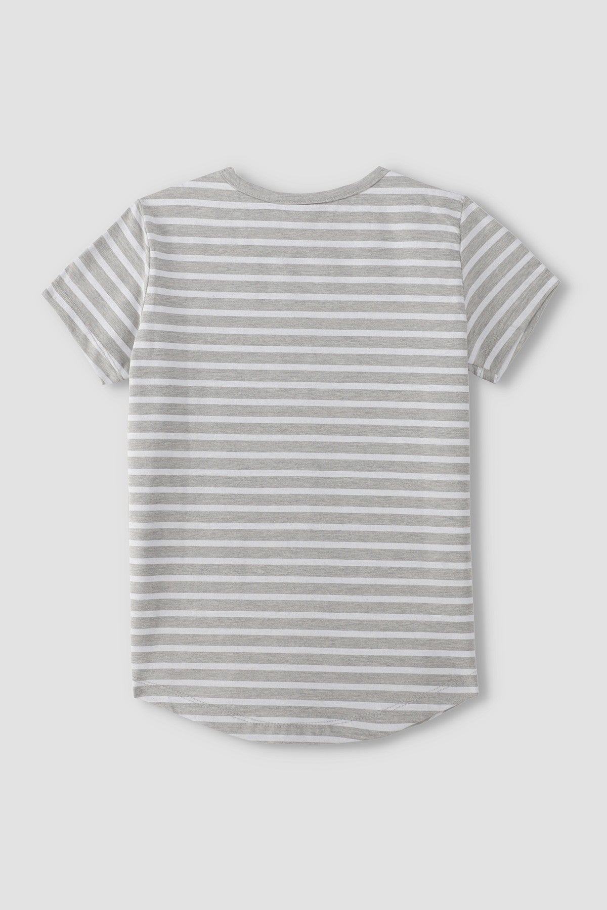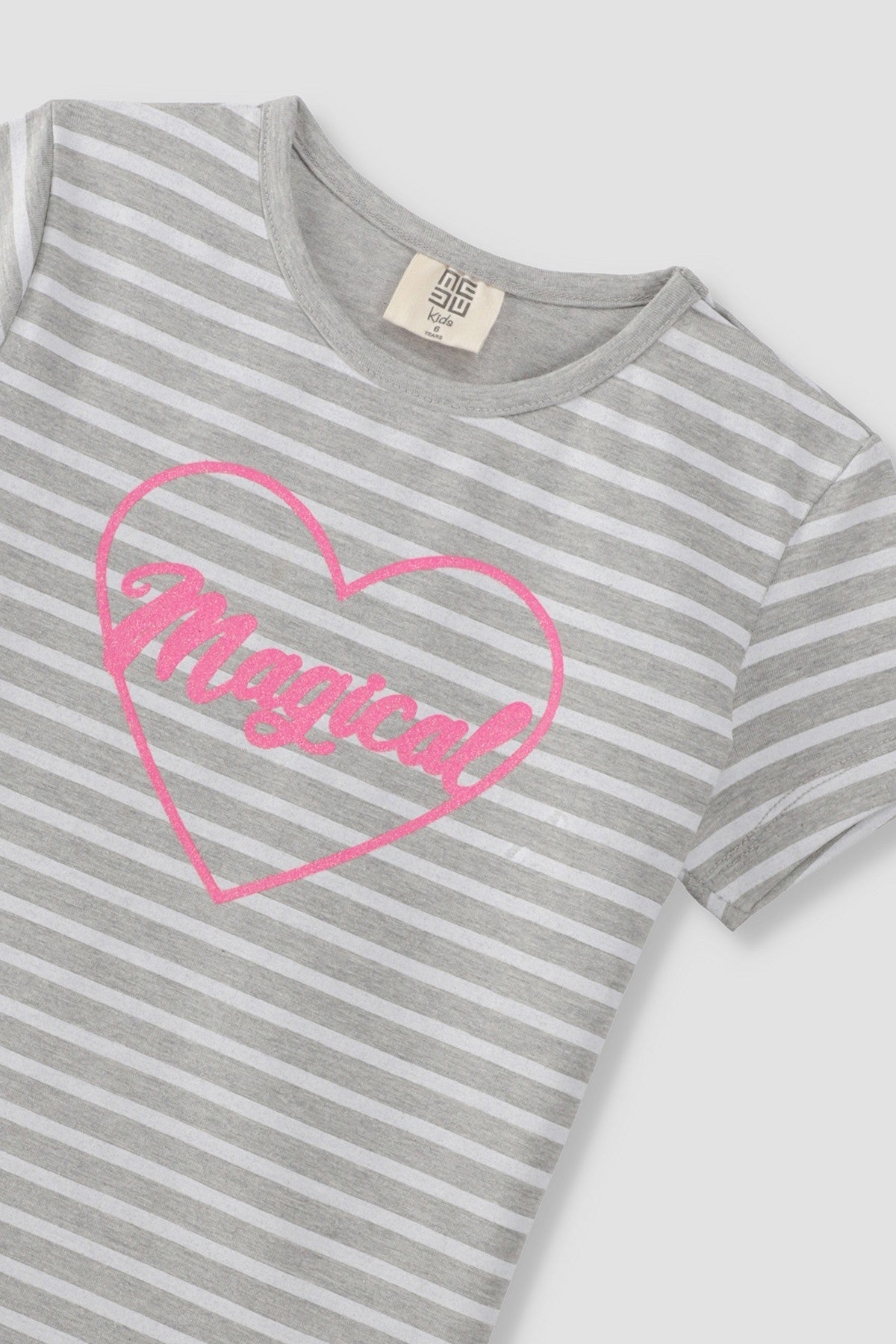 95% Cotton 5% Elastane. Crew Neck With Cap Sleeves. Striped Print And Magical Slogan.