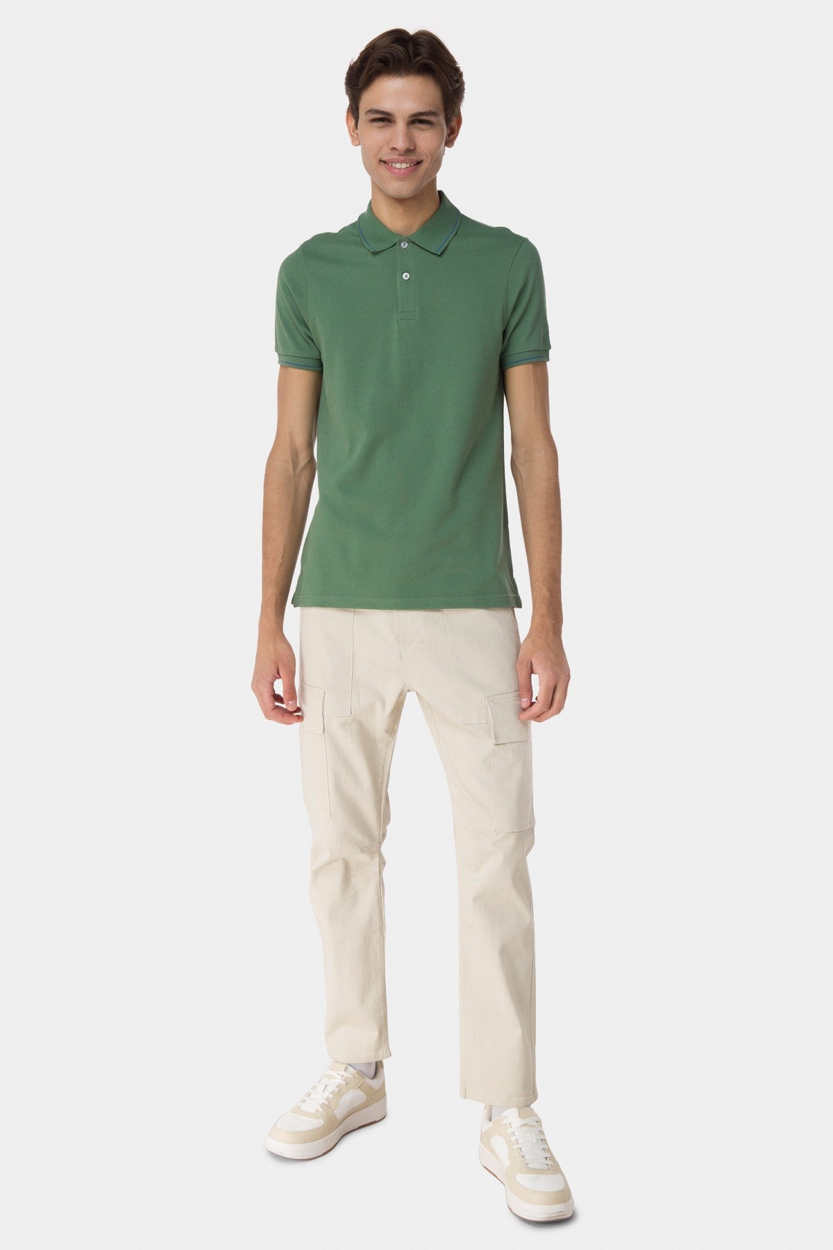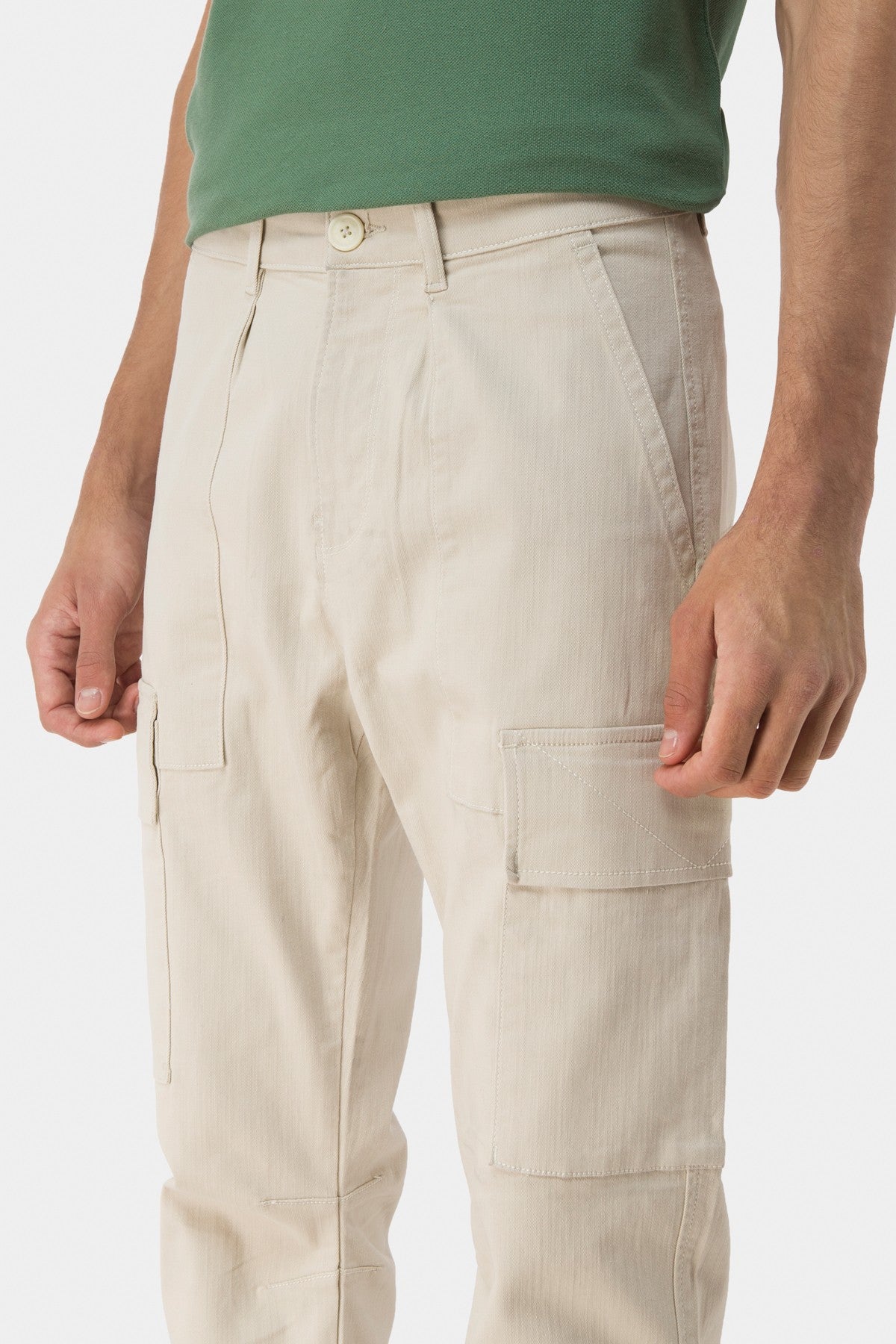 98% Cotton 2% Elastane. Regular Waistband With Centre Front Button And Loops. Front Slash Pockets And Cargo Pockets. Rear Welt Pockets.