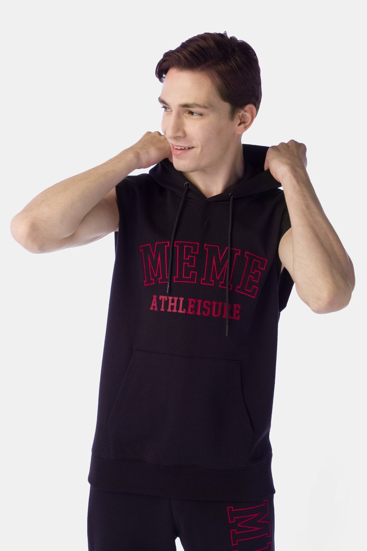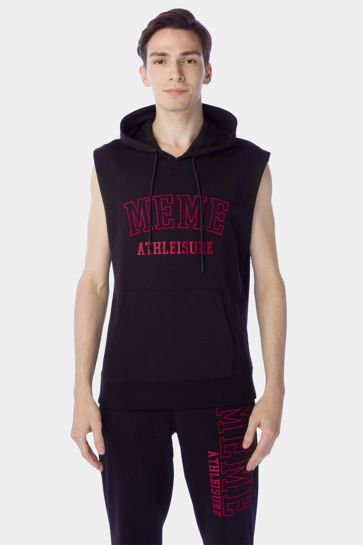 80% Cotton 20% Polyester. Sleeveless Full Cut Sweatshirt. Hooded Collar. Front Pouch Pocket. Rib Trim.