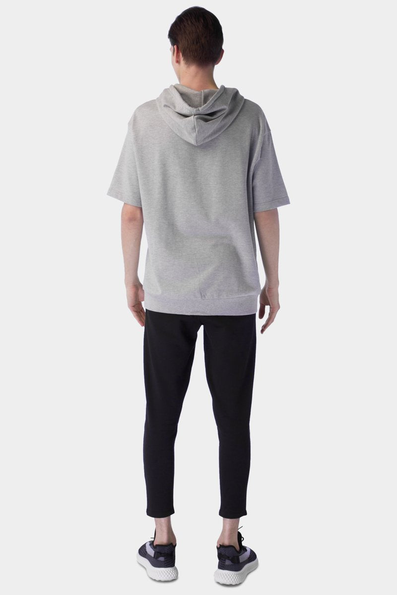 80% Cotton 20% Polyester Hygge Slogan Oversize Solid Front Close Hoodie With Contrast Drawstring. Front Kangaroo Pockets. Short Sleeves. Ribbed Hem