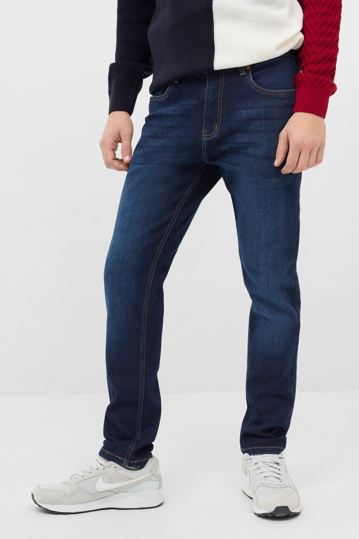 Regular Waist Band. Metal Bronze Rivets. Centre Front Button And Loops. Front Slash Pockets. Single Coin Pocket. Rear Patch Pockets And Yoke.