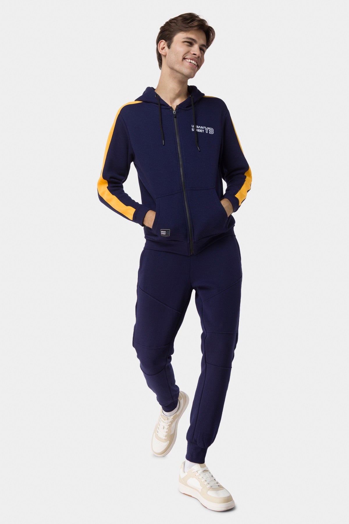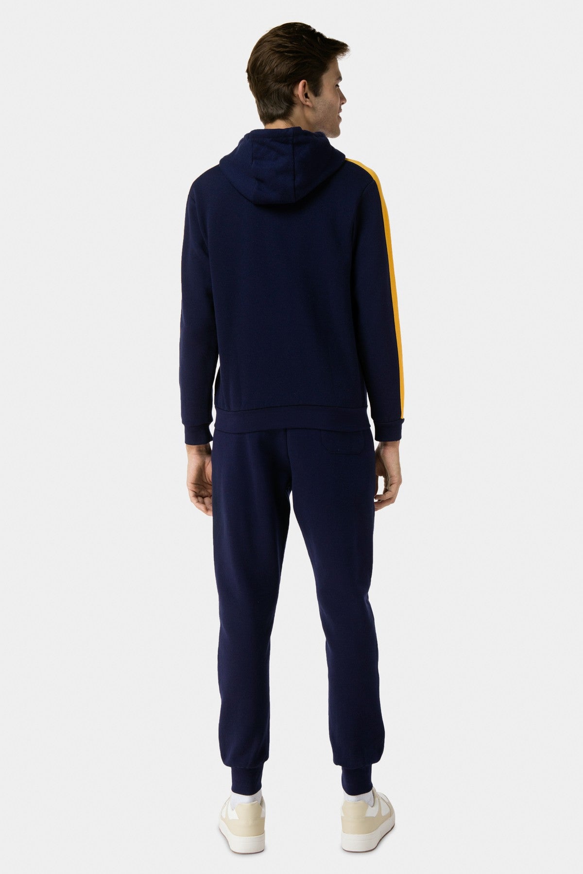 60% Cotton 40% Polyester Brushed Fleece.. Adjustable Hood With Zip Up Closure. Front Kangaroo Pockets. Long Sleeves With Stripes. Patchwork And Logo Details. Ribbed Cuff And Hem