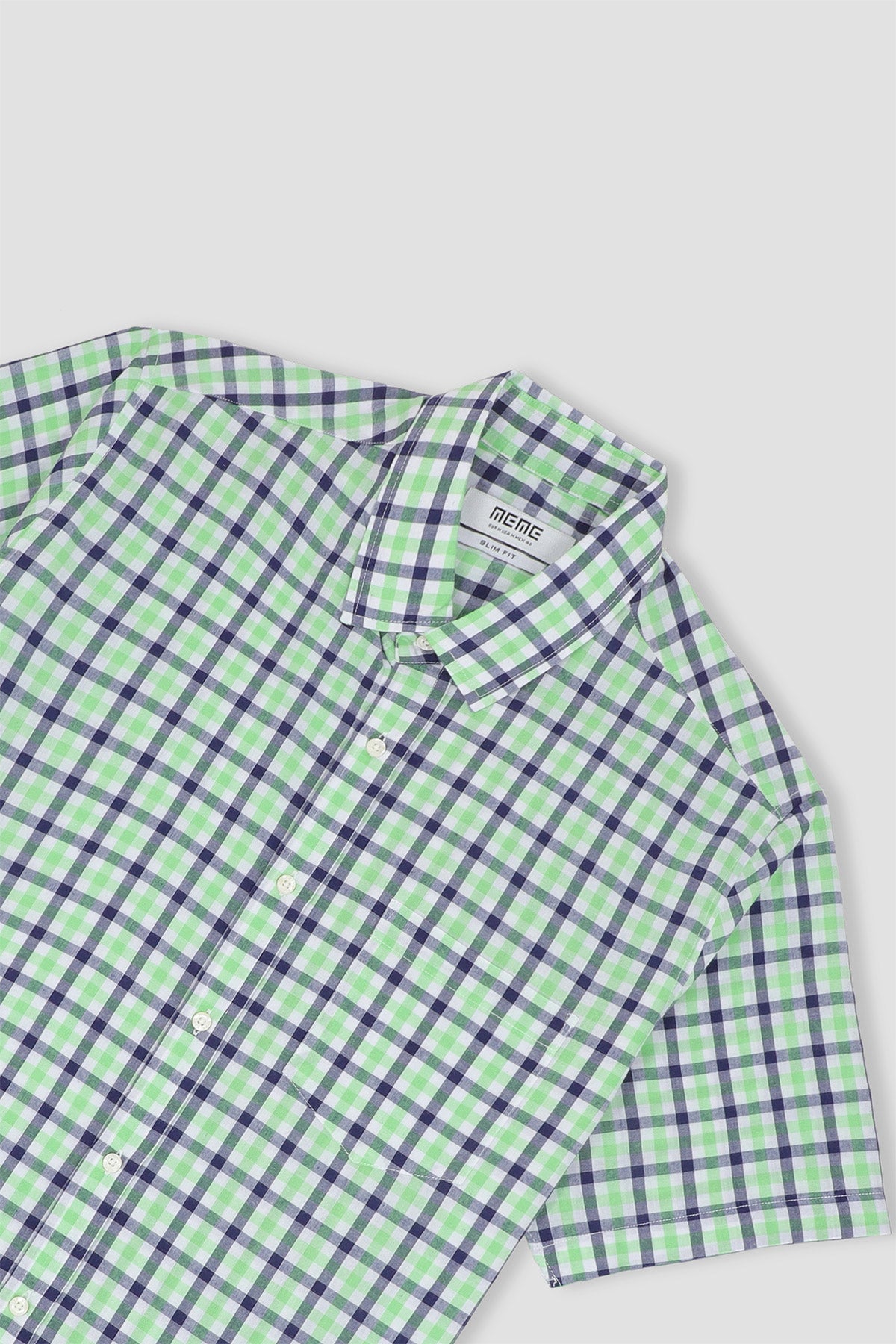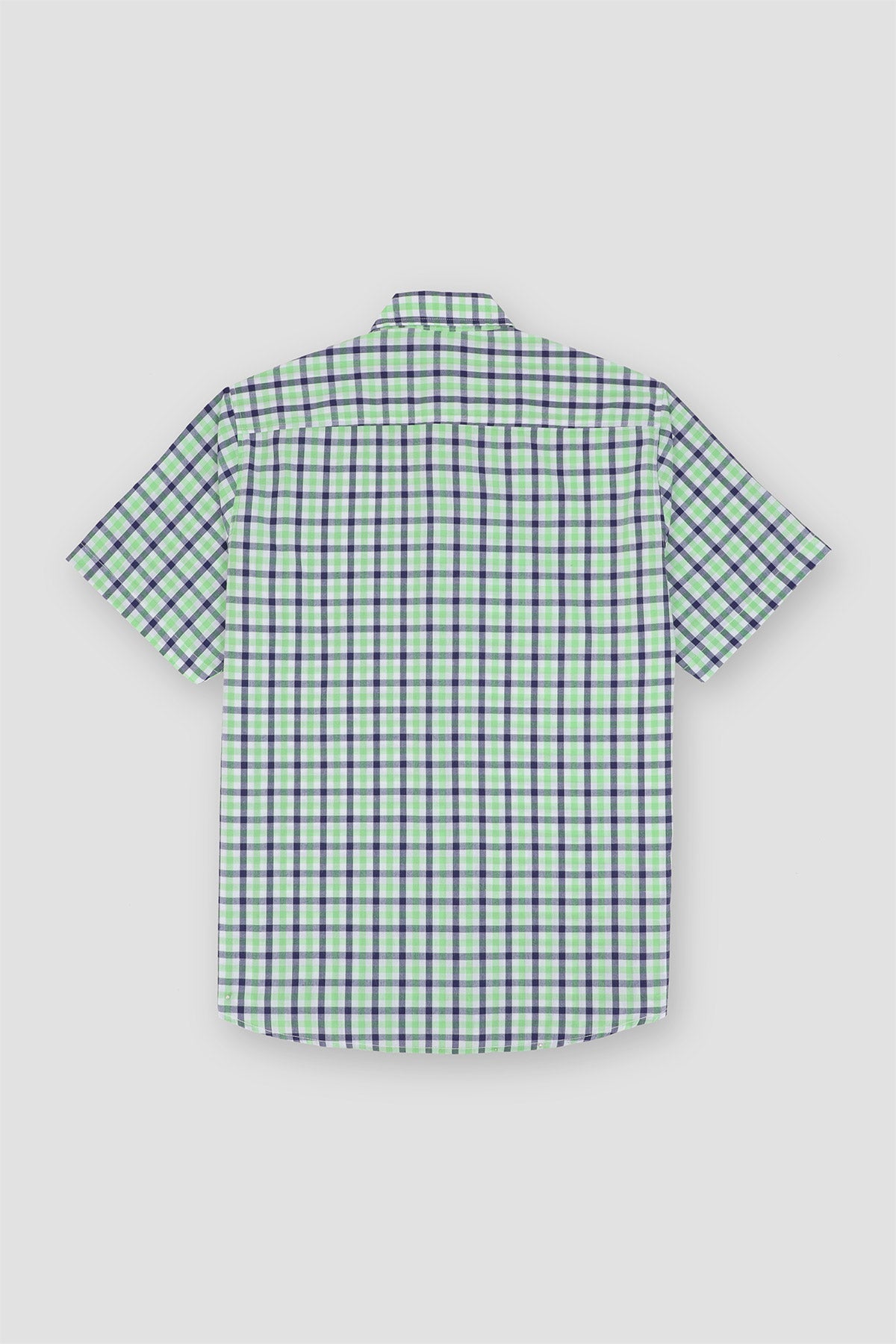 Poly Cotton. 65% Cotton 35% Polyester. Checkered Button Down. Slim Fit. Regular Collar. Short Sleeves. Front Patch Pocket.