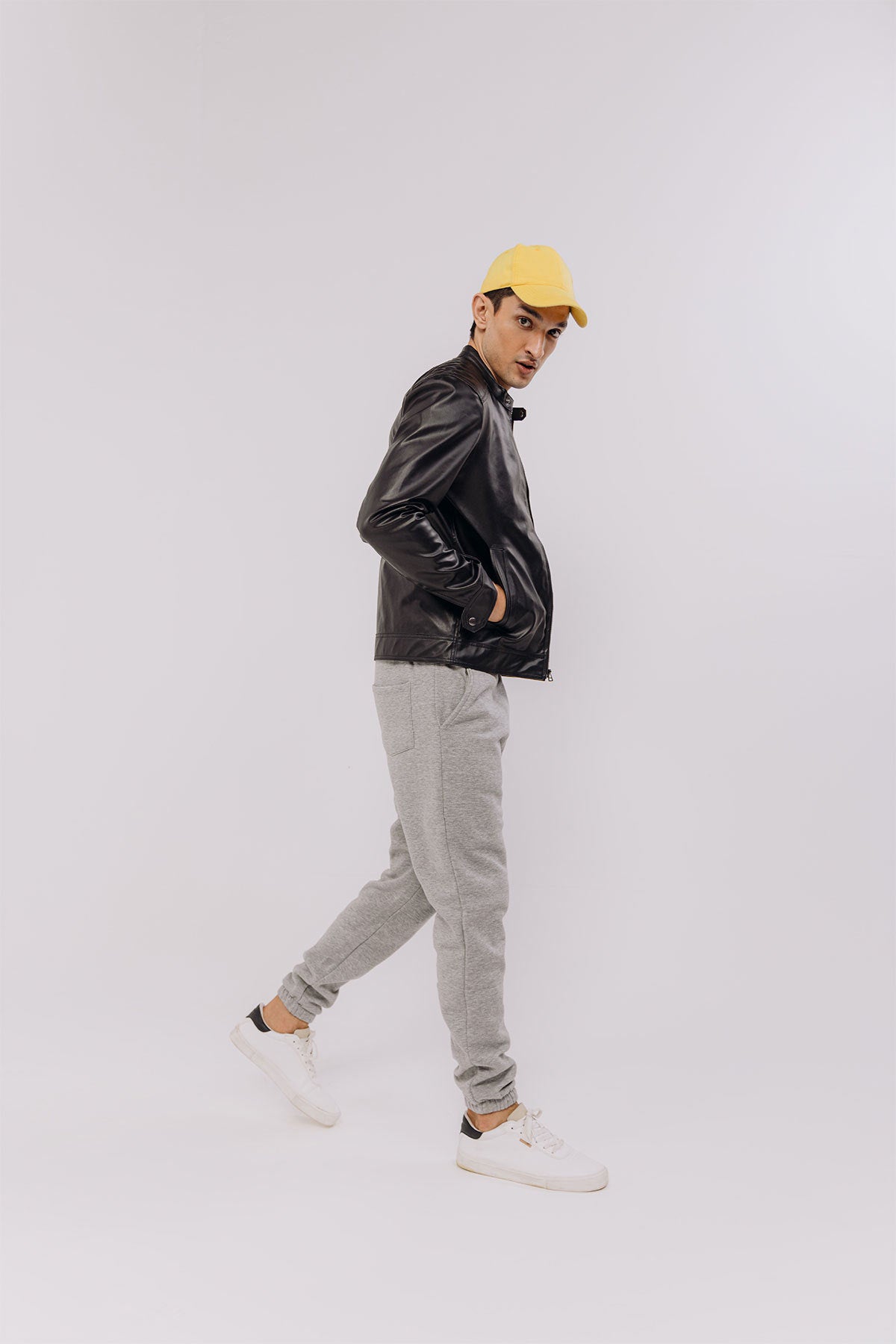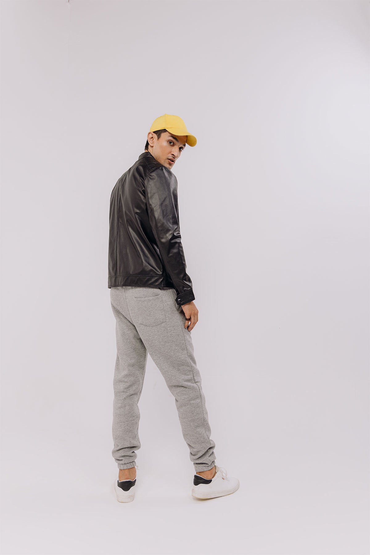 100% Polyester. Classic Leather Jacket With Buttoned Collar And Front Zip Up. Featuring Detail On Shoulders, Button On Each Sleeve Hem And Front Welt Pockets.
