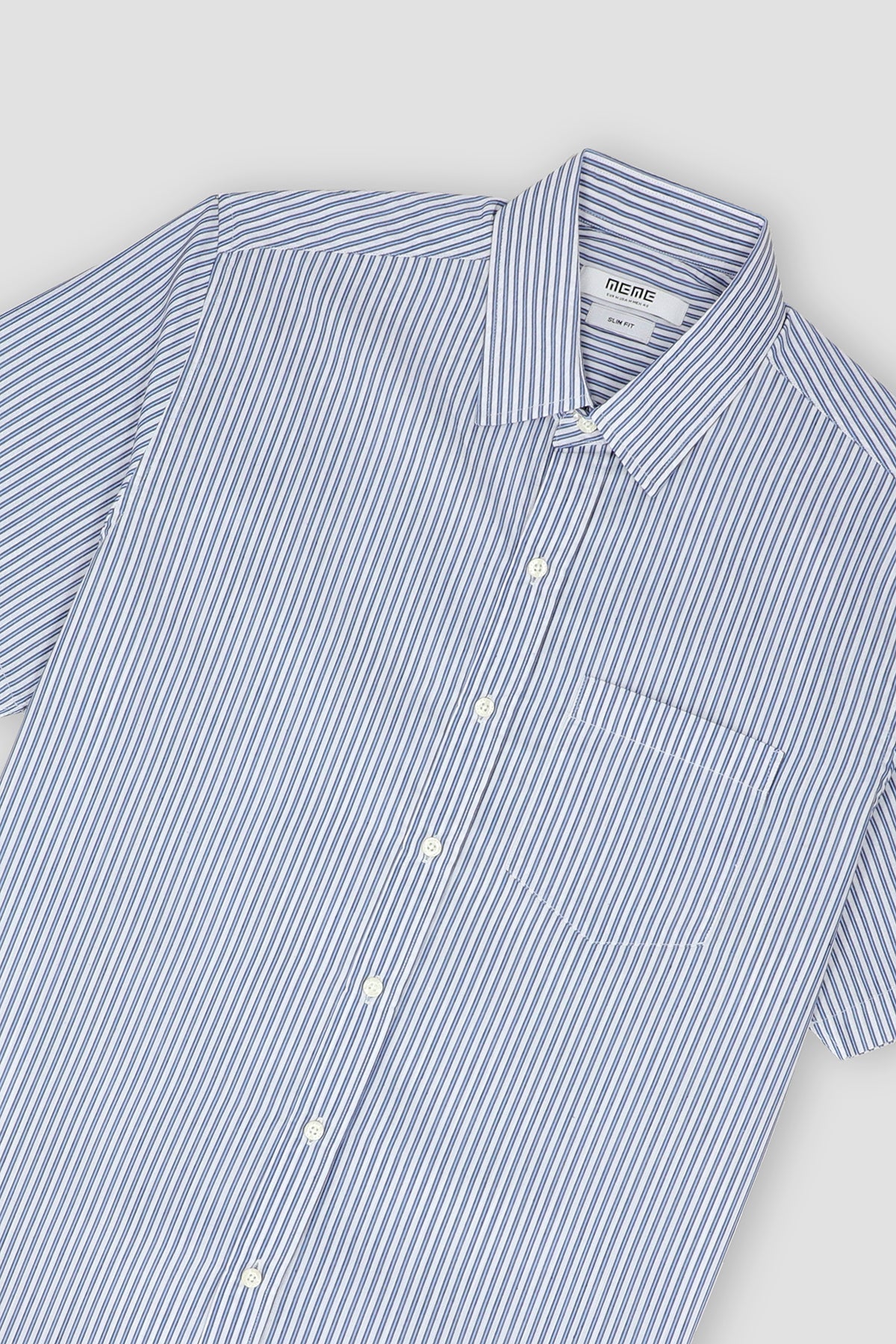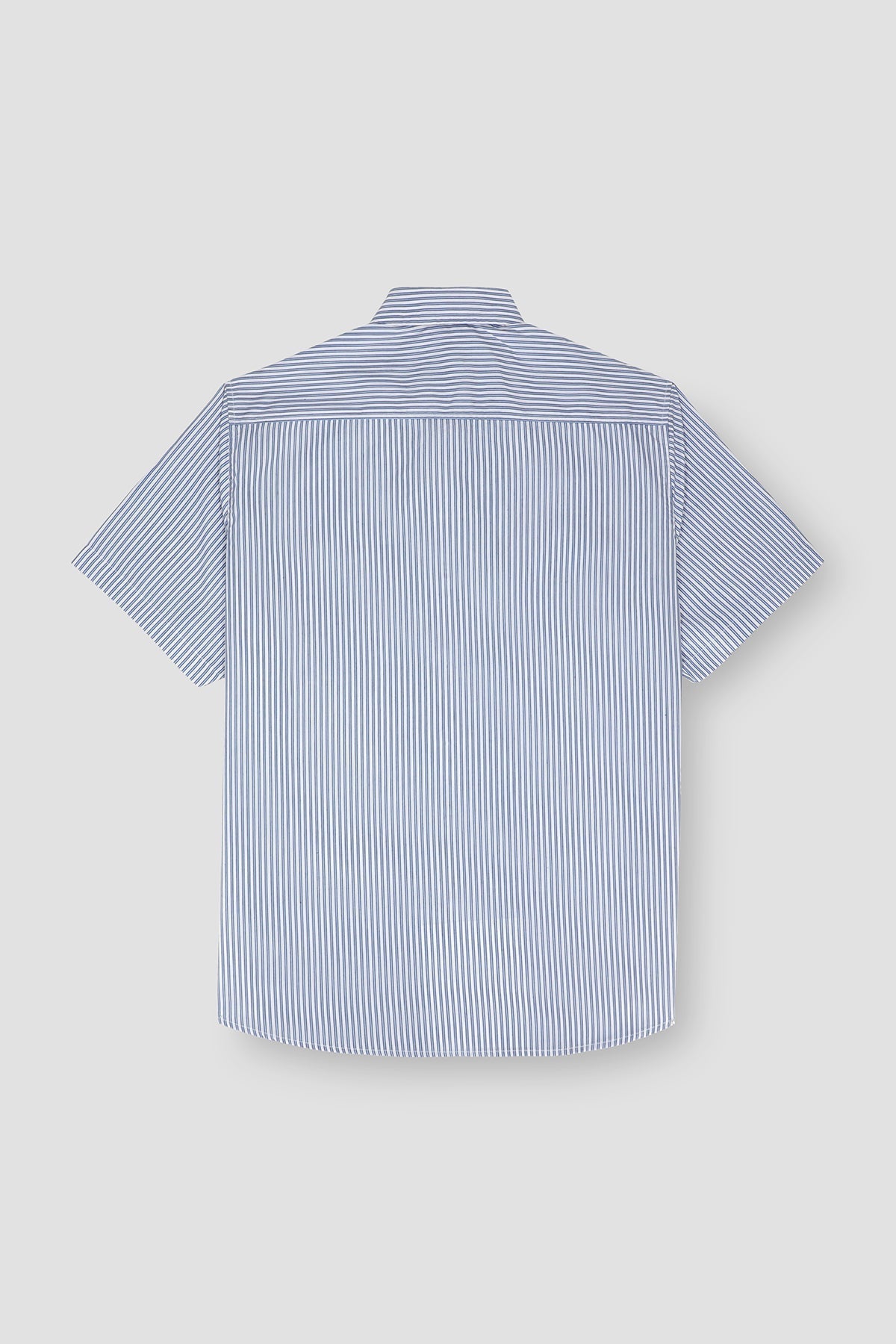 65% Cotton 35% Polyester. Comfortable Striped Button Down With Regular Collar And Short Sleeves. Featuring Front Pocket