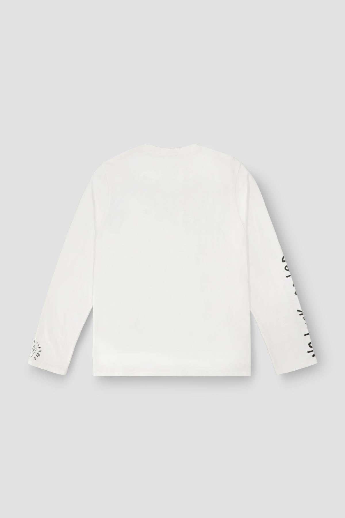 100% Cotton. Casual And Comfortable Neutral Ribbed Crew Neck T-Shirt Featuring Long Sleeves With Typography. Front Illustration And Typography