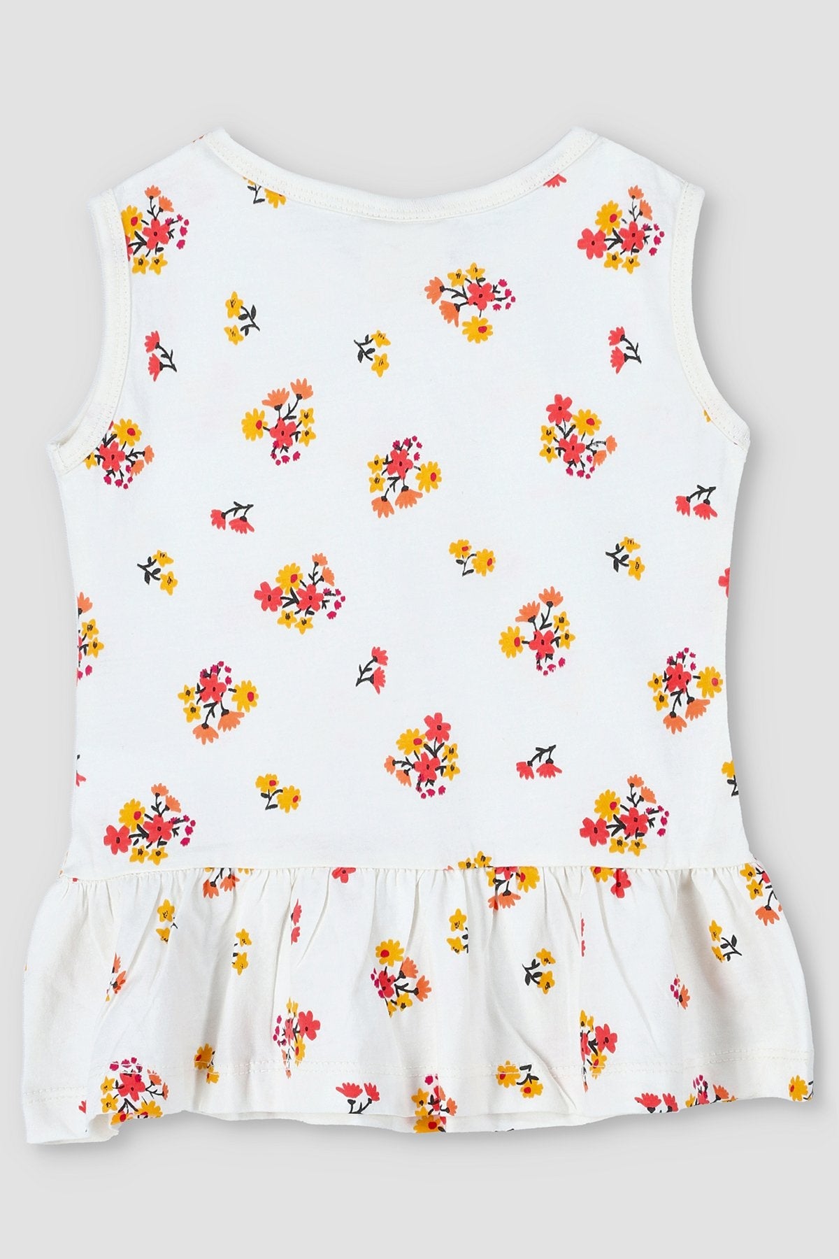 100% Cotton Jersey. Floral Printed Sleeveless Top With Crew Neck. Waist Gathers