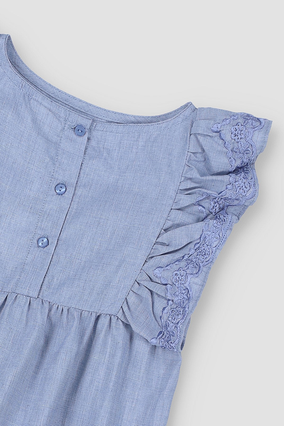 Chambray Denim 100% Cotton. Indigo Button Up Closure Dress. Cap Sleeves With Embroidered Hem. Waist Gathers. Embroidered Hem And Ruffles