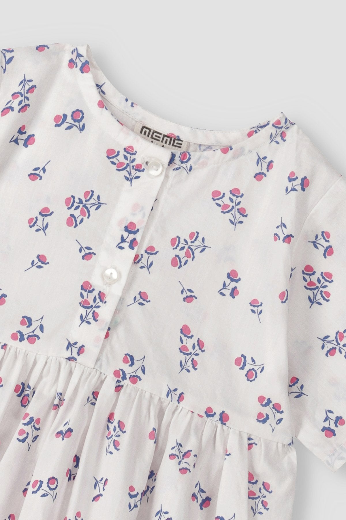 Poplin 100% Cotton. Floral Print Dress With Front Button Up Closure. Short Sleeves With Waist Gathers