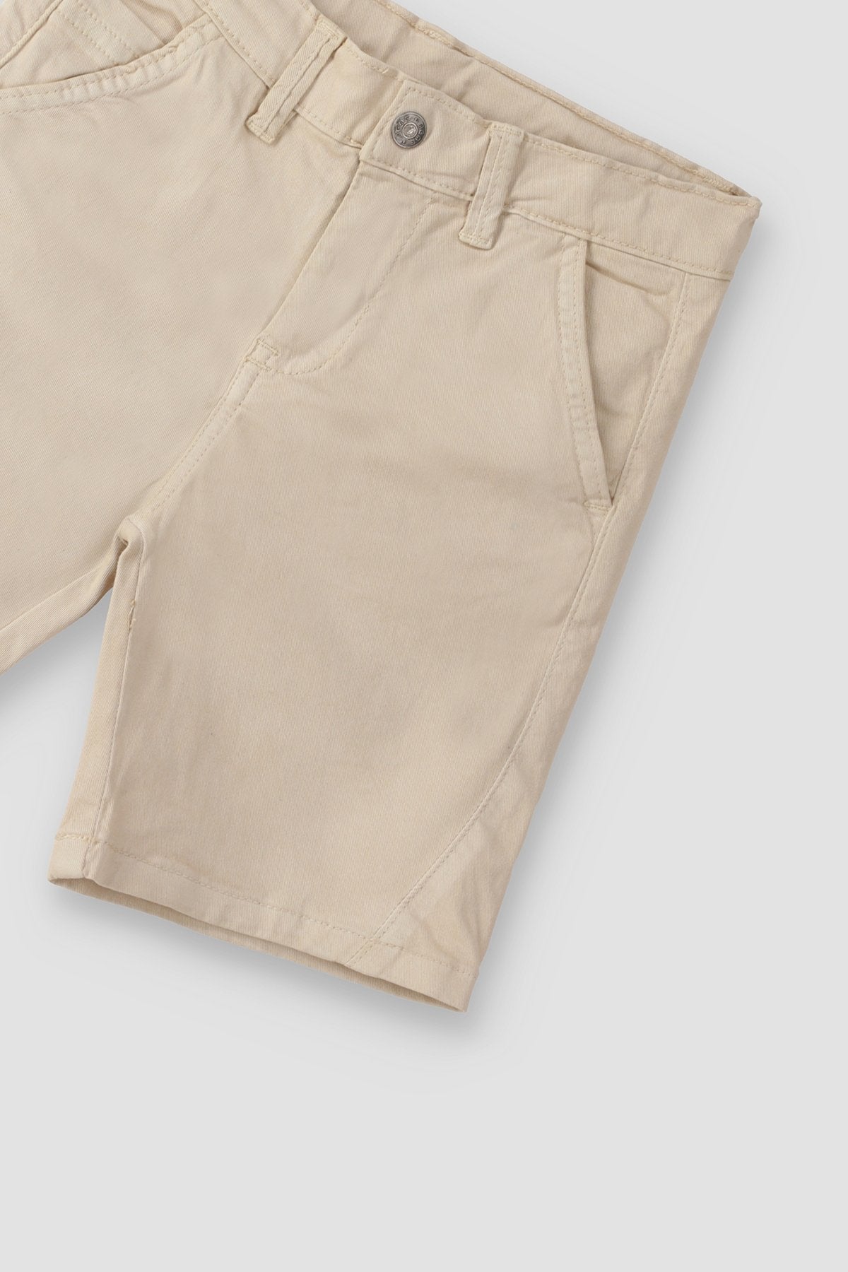100% Cotton Chino Twill. Chino Shorts With Regular Waist Band. Center Front Metal Button And Loops. Single Coin Pocket. Front Slash Pockets. Curved Seam Hem. Back Waist Darts And Welt Pockets.