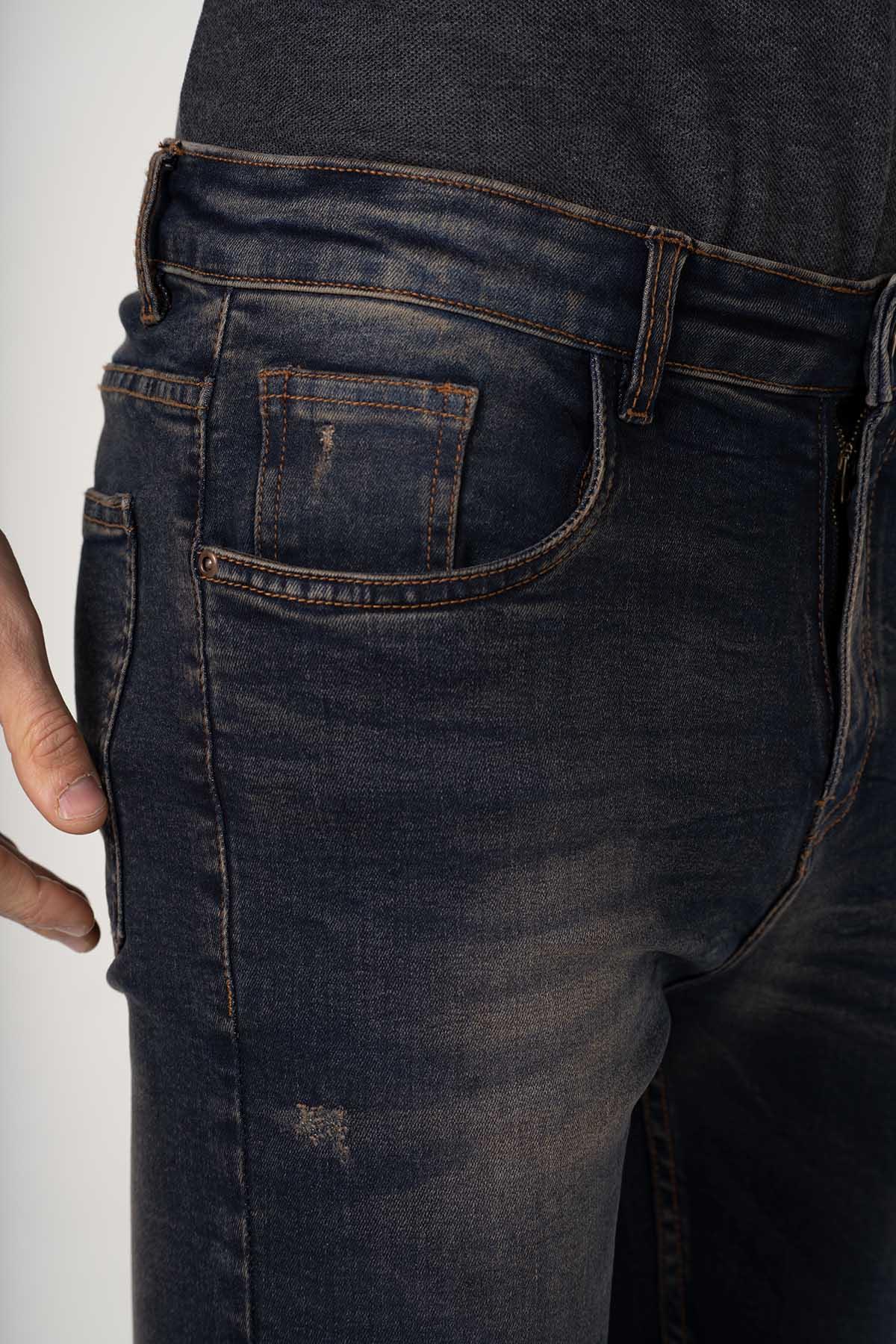 Regular Waistband With Button And Loops. Slash Pockets. Front Distressed Details. Rear Yoke And Patch Pockets. Narrow Hem