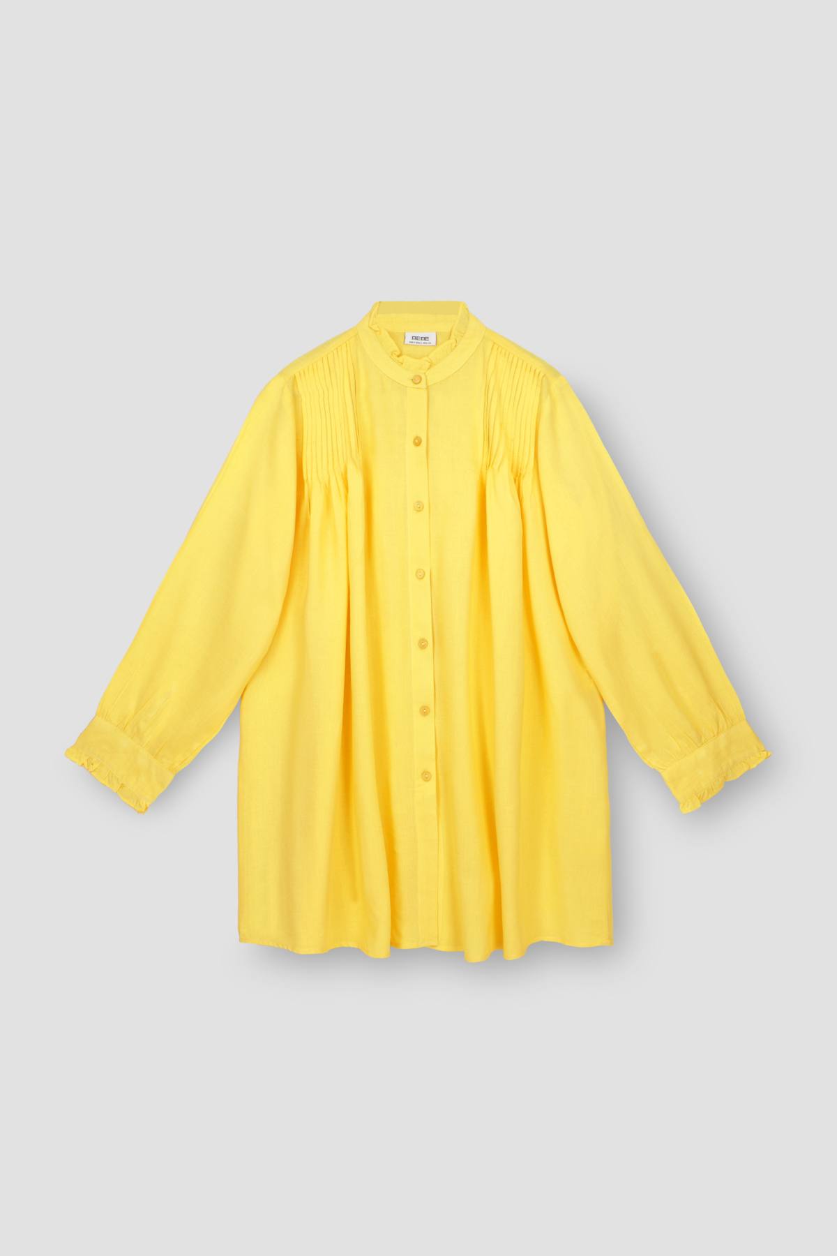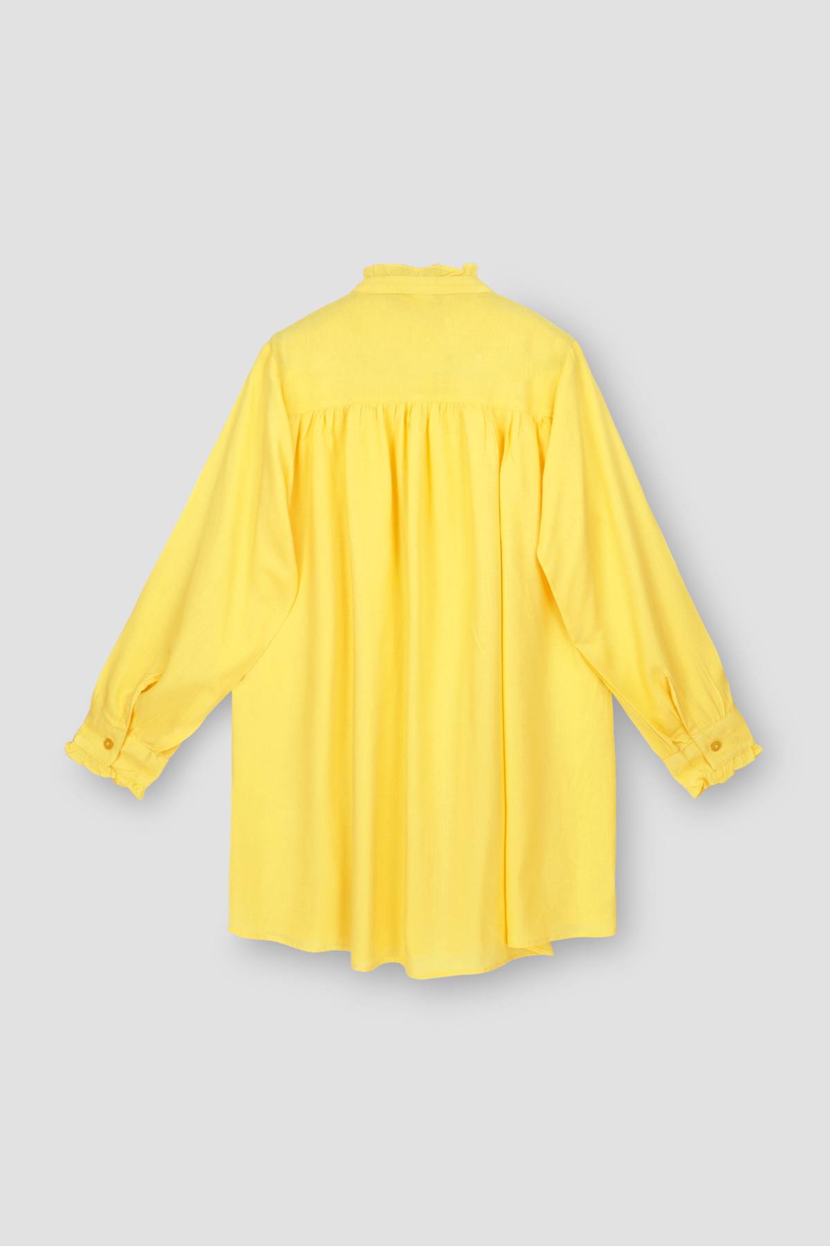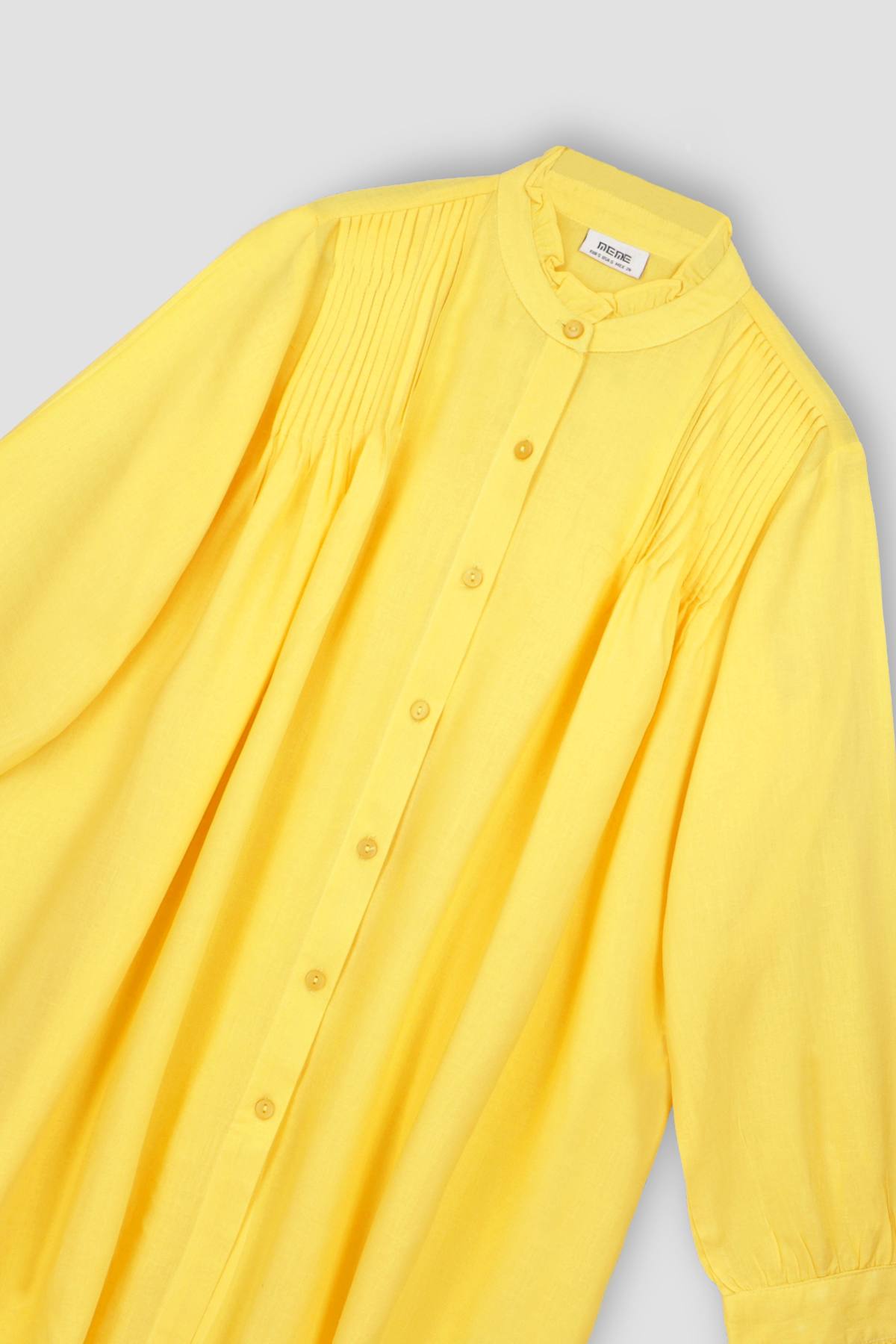 100% Cotton. Classic Pure Cotton Vibrant Button Down Pleated Top Featuring Band Collar And Long Sleeves With Button Closure Cuff And Ruffles. Subtle Ruffles On Collar And Shoulder Pleats. Rear Yoke With Subtle Gathers. Curved Hem