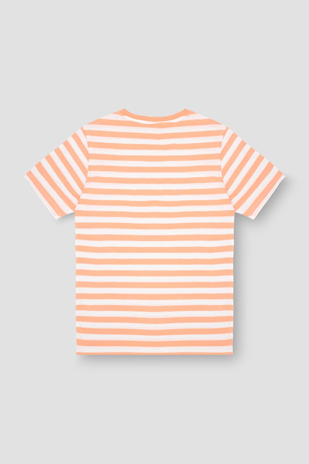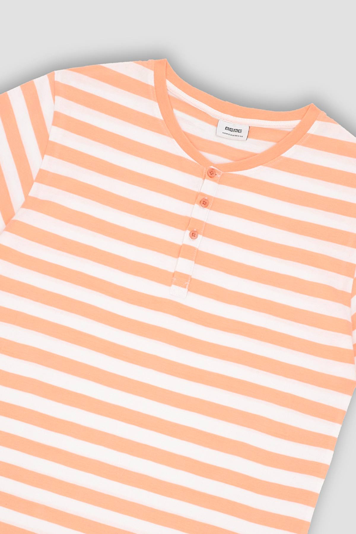 100% Cotton. High Quality Single Jersey Striped Printed Bias Trimmed Henley Neck T-Shirt Featuring Short Sleeves